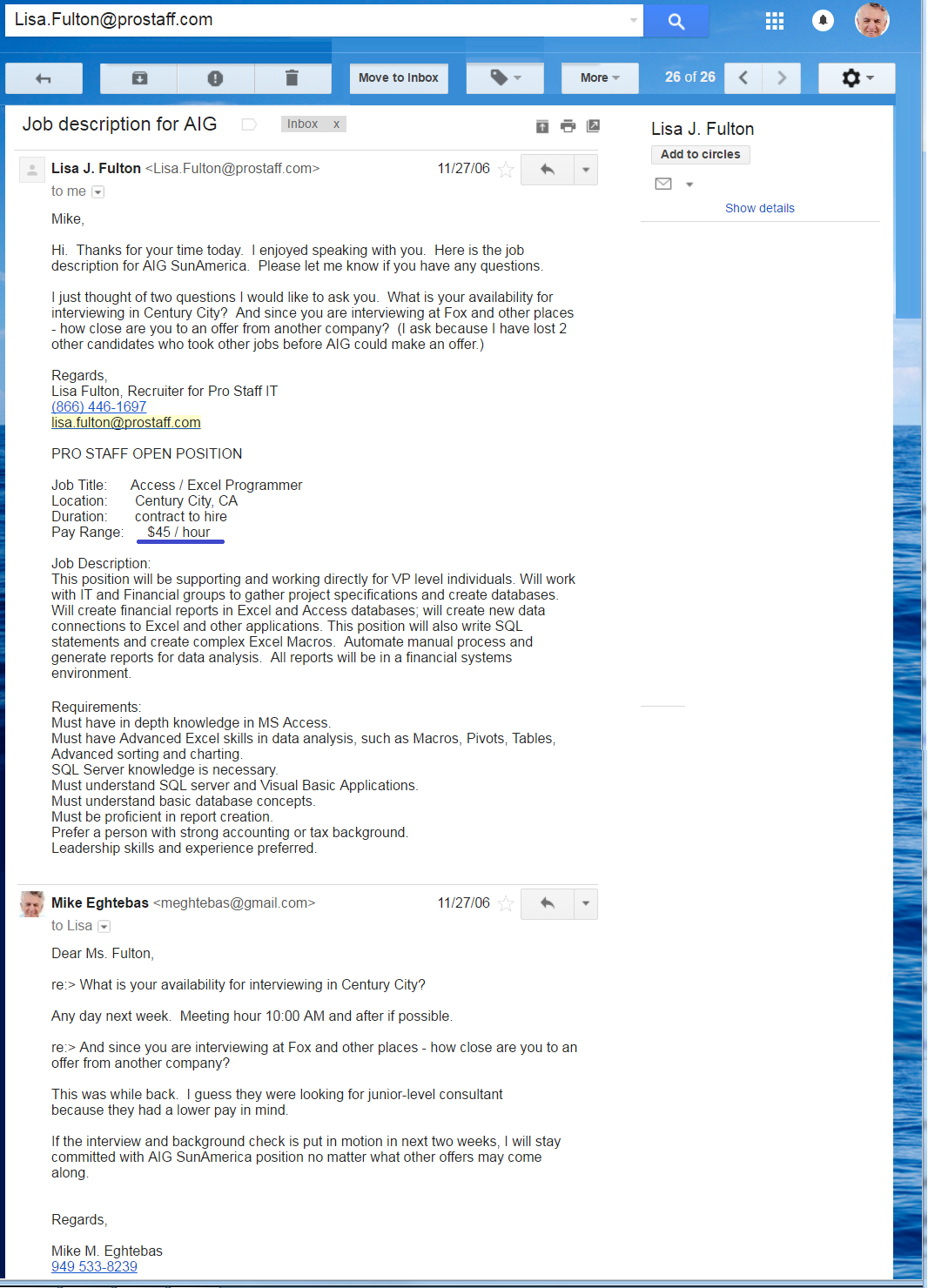 The interview was handled by two vice presidents and one senior IT manager which lasted for three hours during which time I demoed some past sample projects. I agreed to start contract to hire bases. That evening before I arrived at my home in Orange County, I got a call from Lisa Fulton (of Pro Staff IT) that I was hired. Per discussion I have had earlier with Mrs. Fulton, I had agreed with $45 per hour starting pay rate , but a few days later during signing my contract at ProStaff IT in Culver City, CA office, I noticed the pay rate has been increased by $2.5 per hour to $47.50. This was a nice surprise to which I had no objections. The second surprise came about, when I received my first paycheck with yet another $2.5 per hour increase at $50.00 per hour. Now, including two weeks of vacation time ProStaff added to my benefits, my starting annual salary was about $110K.