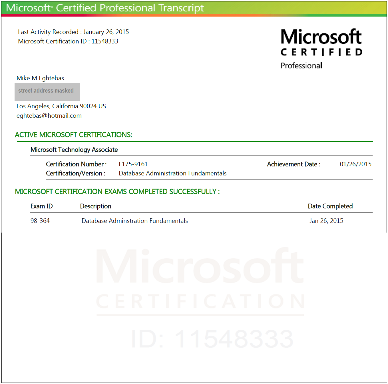 - MTA Database track, data platyform adminstration and business intelligence. Passed on January 2015. MTA 98-364